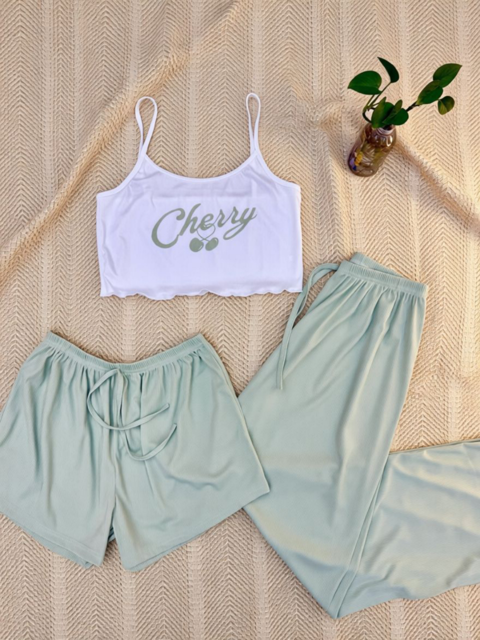 ست سه تیکه کراپ تاپ شرتک شلوار کبریتی