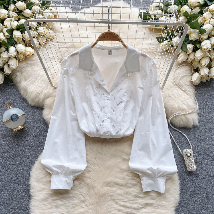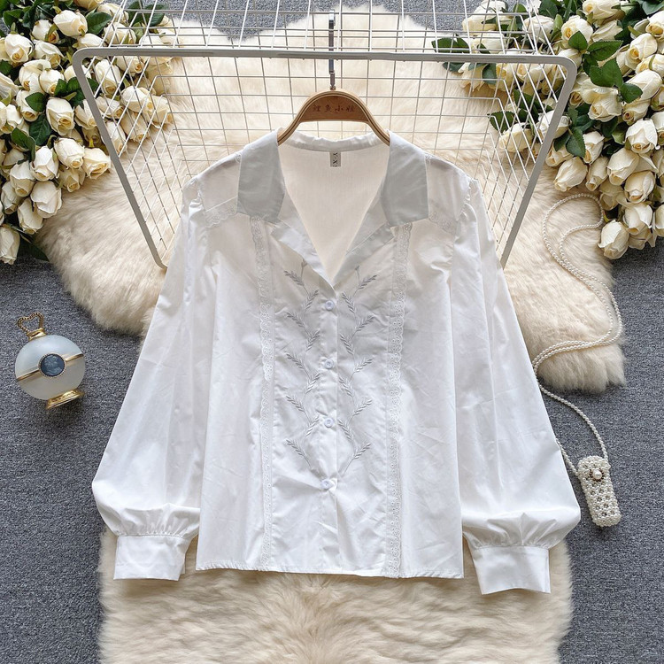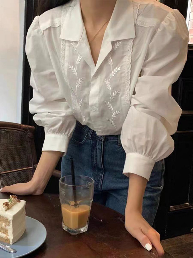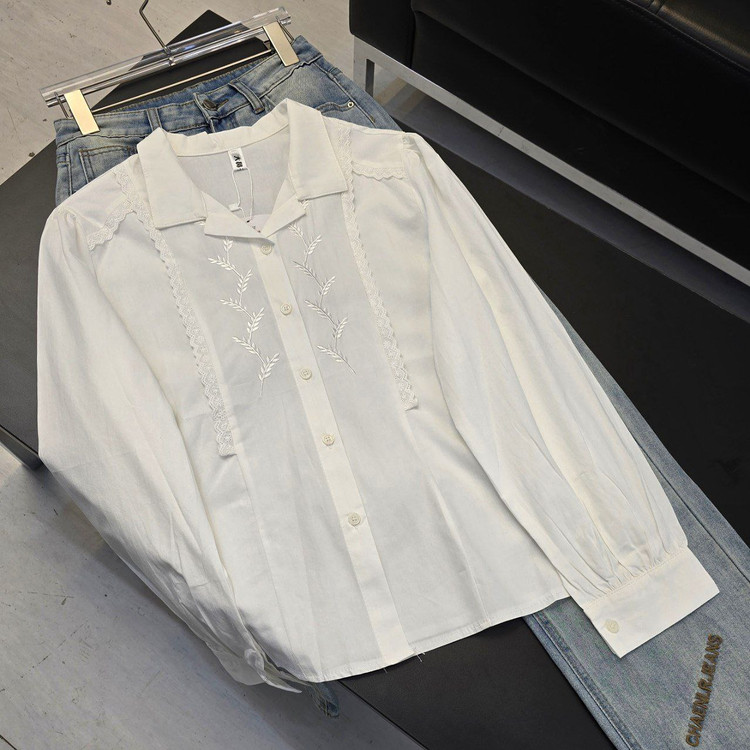 شومیز کتان کاغذی سفید گلدوزی گندمی